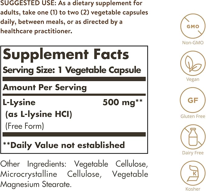 - Non-GMO & Gluten Free; Solgar L-Lysine Vegetable Capsules are suitable for vegans and vegetarians; Free of: gluten, wheat, dairy, soy, yeast, sugar, sodium, artificial flavor, sweetener, and color