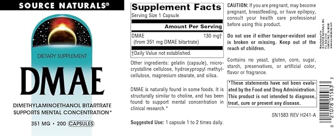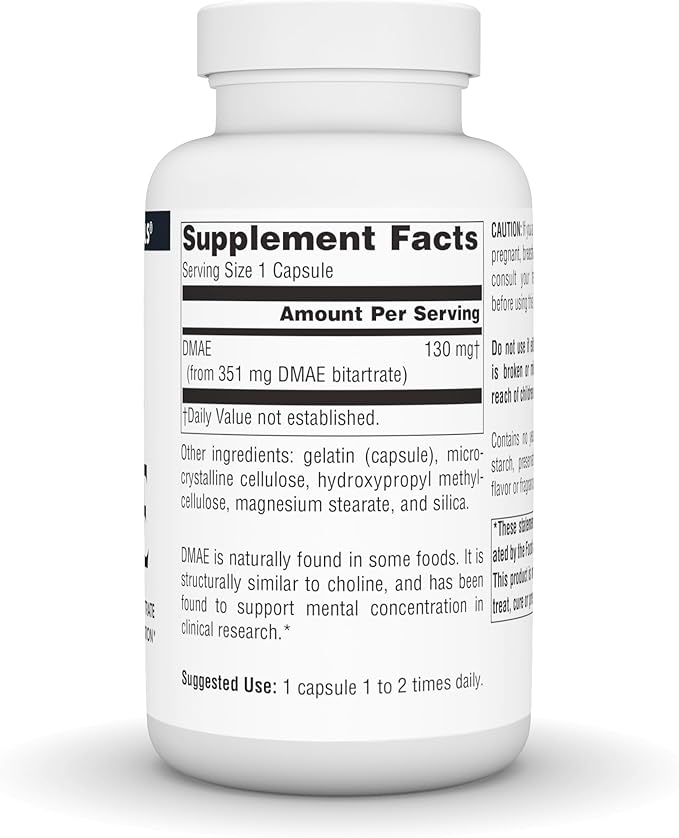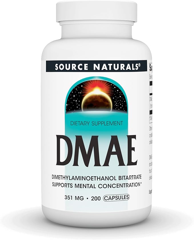 Source Naturals DMAE, Dimethylaminoethanol Bitartrate - Supports Mental Concentration - 200 Capsules