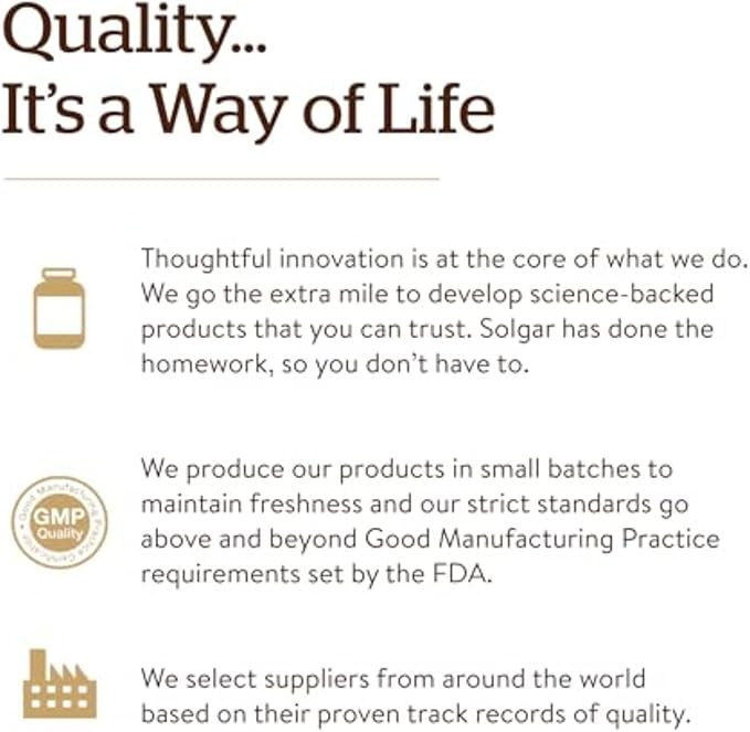 - The Gold Standard: For over 70 years Solgar has been committed to quality, health, and well-being. Our mission is to create the finest nutritional supplements in small batches, through tireless research, using only the finest raw materials