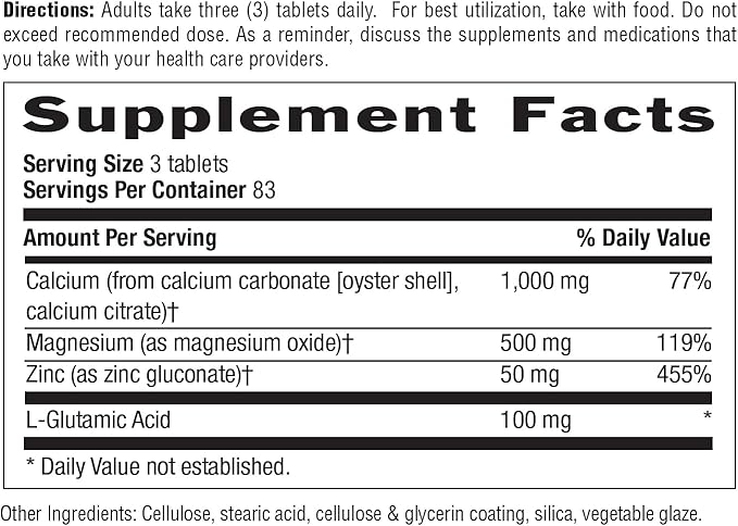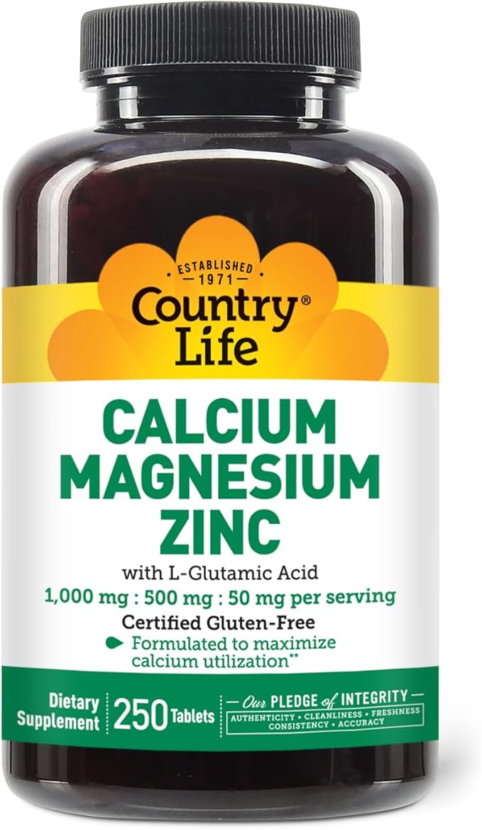 Country Life Calcium Magnesium Zinc with L-Glutamic Acid, Dietary Supplement for Bone Support, Certified Gluten Free, 1000mg/500mg/50mg, 250 Tablets