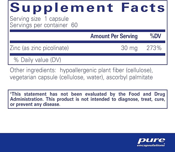 Pure Encapsulations Zinc 30 mg - Supplement for Immune System Support, Growth and Development, and Wound Healing* - with Zinc Picolinate 30 mg - 60 Capsules