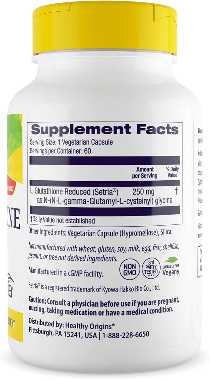 Healthy Origins L-Glutathione 250 mg (Setria, Non-GMO, Gluten Free, Antioxidant, Immune Support, Skin Support), 60 Veggie Caps