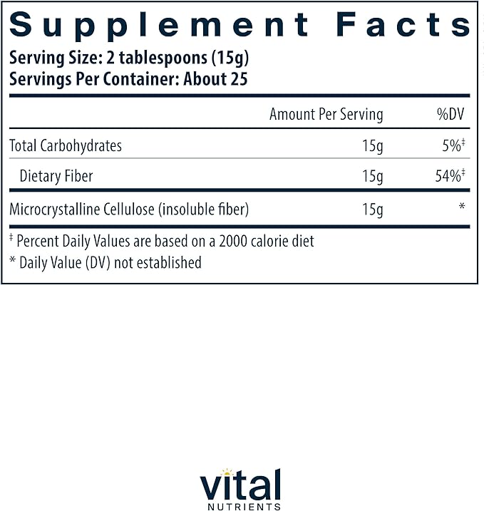 - Cellulose Insoluble Fiber Supplement Supports Healthy Elimination: Vital Nutrients Cellulose Fiber is a vegan source of insoluble fiber to increase stool bulk and promote normal daily bowel function*
