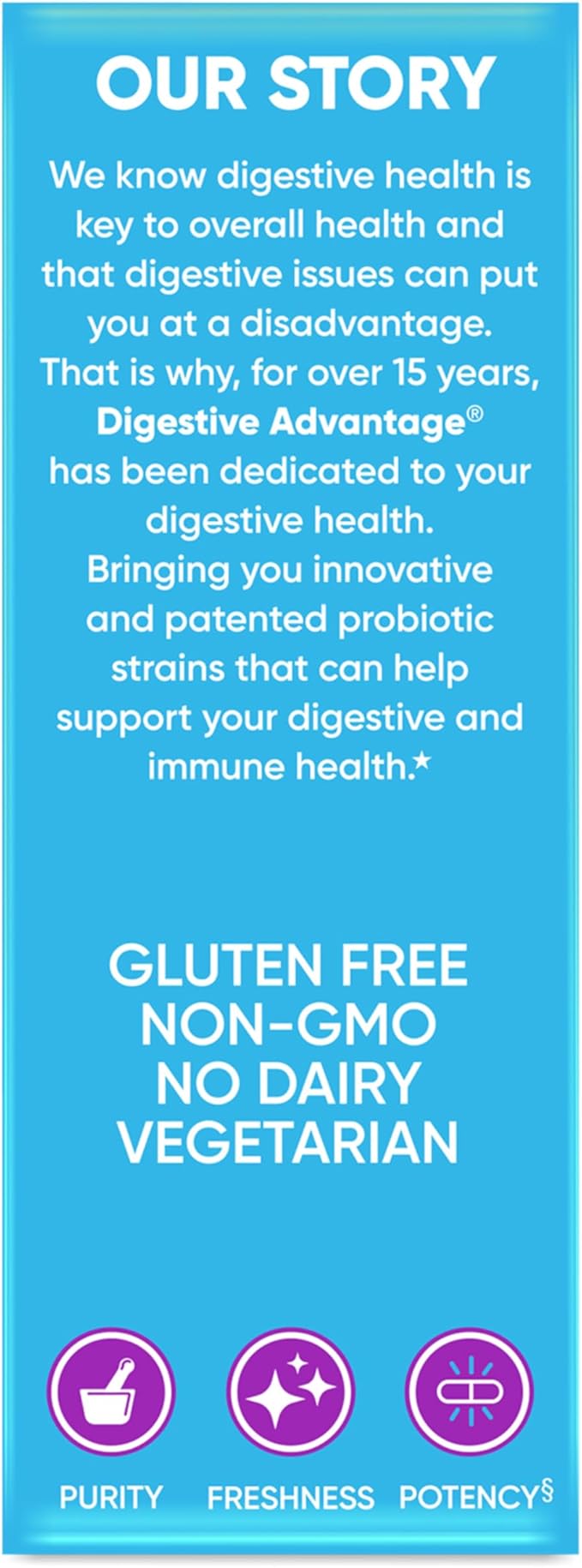 - Digestive Advantage Daily Probiotic capsules are Gluten Free, Non-GMO, No Dairy, Vegetarian, and are guaranteed for Purity, Freshness, Potency.