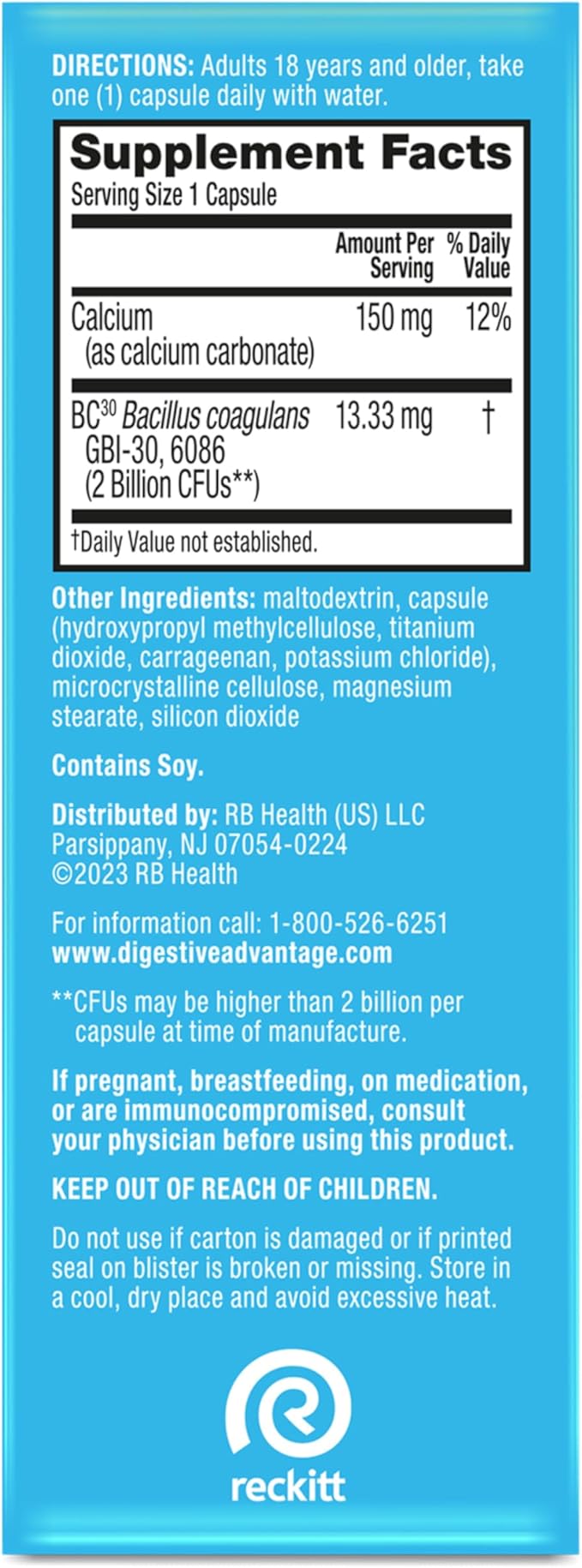 Daily Probiotic Capsule - Digestive Advantage 30 Capsules, Survives 100x Better, Lessens Bloating, Calcium, Promotes Digestive Health and Gut Flora, multi