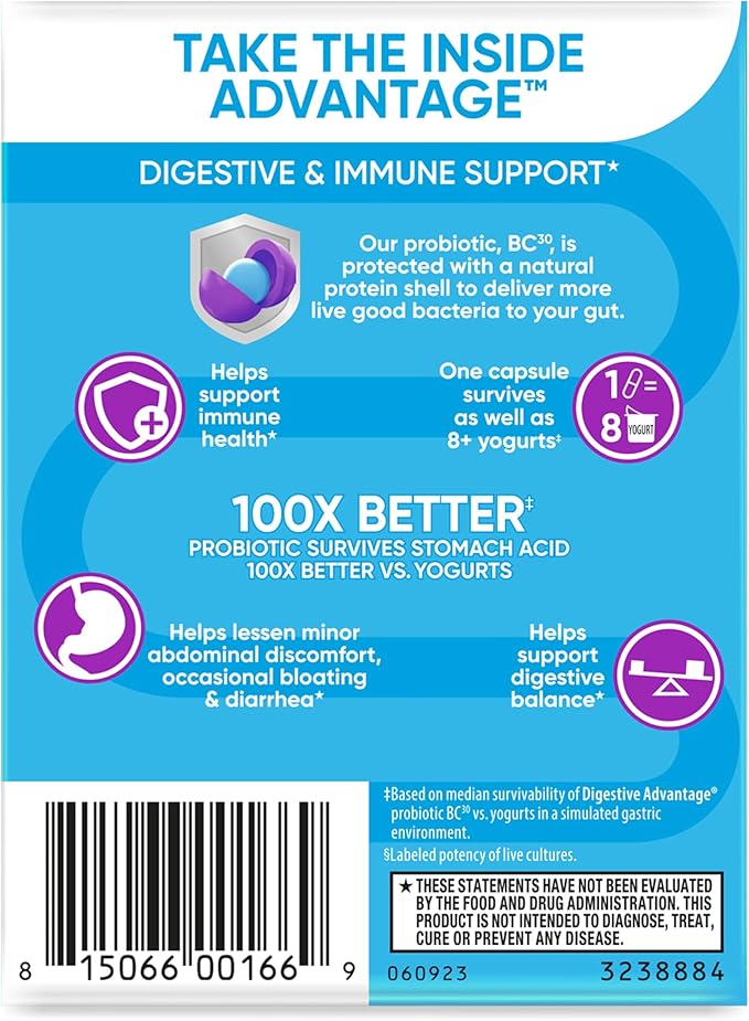 - IMMUNITY: 70% of your immune system is in your digestive tract. The good bacteria in Digestive Advantage Daily Probiotics helps support the immune cells in your gut.