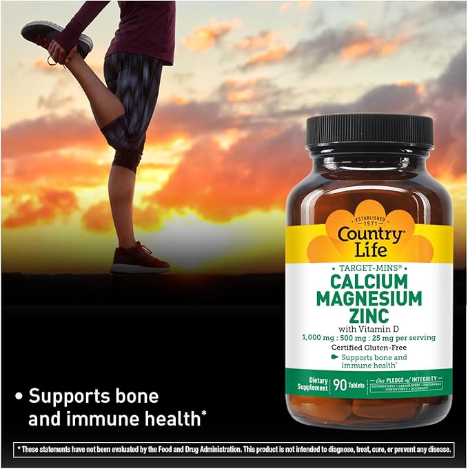 Country Life Calcium Magnesium Zinc with Vitamin D3 and L-Glutamic Acid, Dietary Supplement for Bone Support, Certified Gluten Free, 1000mg/500mg/25mg, 90 Tablets