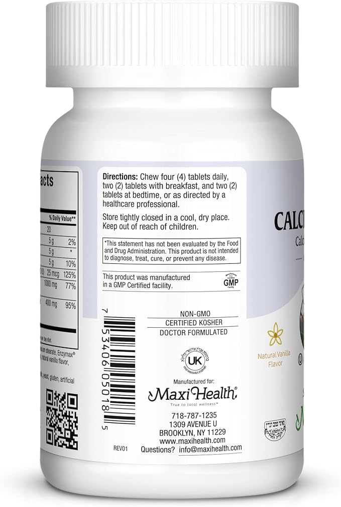Maxi Health Chewable Calcium Complex – Vanilla Flavor Vitamin D3 and Magnesium Chewables to Help Support Bones – Kosher Magnesium and Calcium Supplement for Women and Men (180 Count)