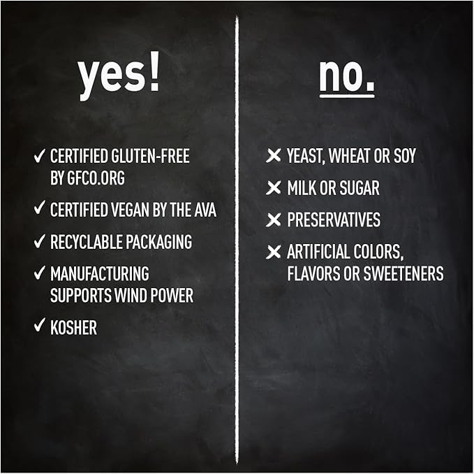- Certified gluten-free, vegan and kosher; No yeast, wheat, soy, milk, sugar, preservatives, artificial colors, flavors or sweeteners
