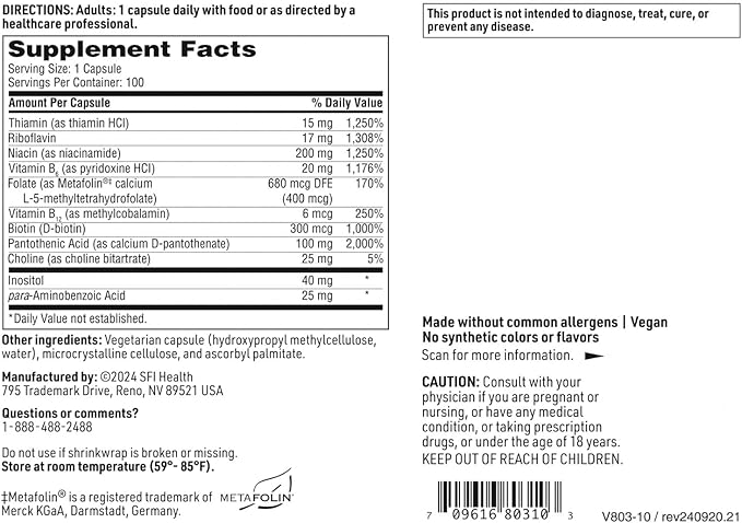 Klaire Labs SFI Health B Complex Plus - High Potency B Vitamin Complex with B12 Methylcobalamin, B6 & Metafolin Folate - Energy, GI Tract & Brain Health Support - Hypoallergenic (100 Capsules)