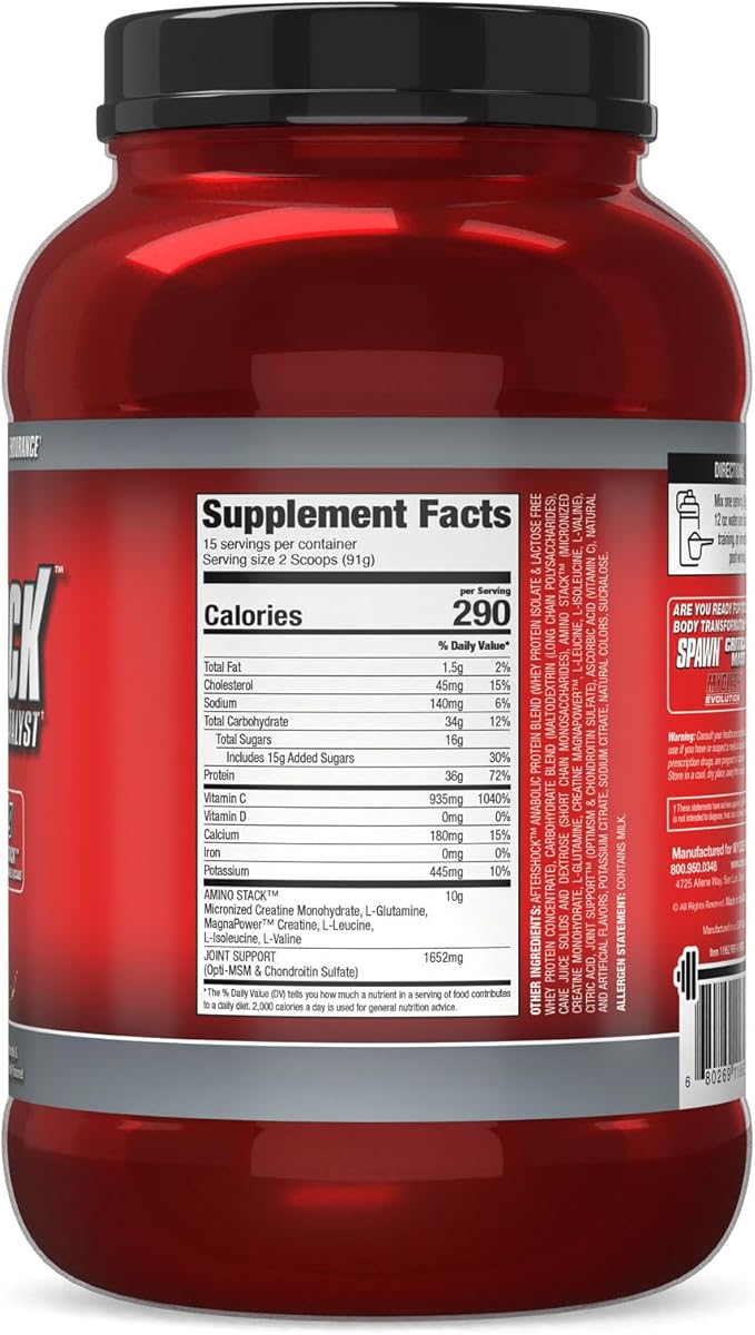 - UNLOCK THE KEY TO MUSCLE GROWTH - Sports research has shown that 30 minutes after your workout your body is primed for a post workout recovery drink. Aftershock, with 34g of lactose free, fast digesting proteins, rapid absorption carbohydrates, and a perfect blend of amino energy is ideal for improving gains, recovery and endurance.