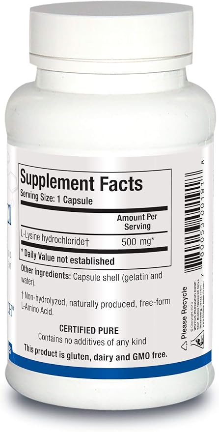 Biotics Research L Lysine HCI Amino Acid L lysine Supplement Promotes Energy, Boosts Immunity, Stimulates Calcium Absorption 100 Capsules
