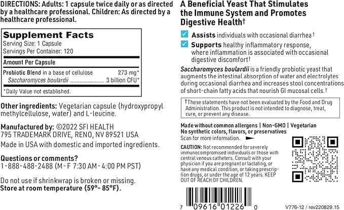 Klaire Labs SFI Health Saccharomyces Boulardii Probiotic - Acid Resistant & Shelf-Stable Supplement to Support Healthy Yeast Balance, Immune & Digestive Health - Hypoallergenic, Dairy-Free (120ct)