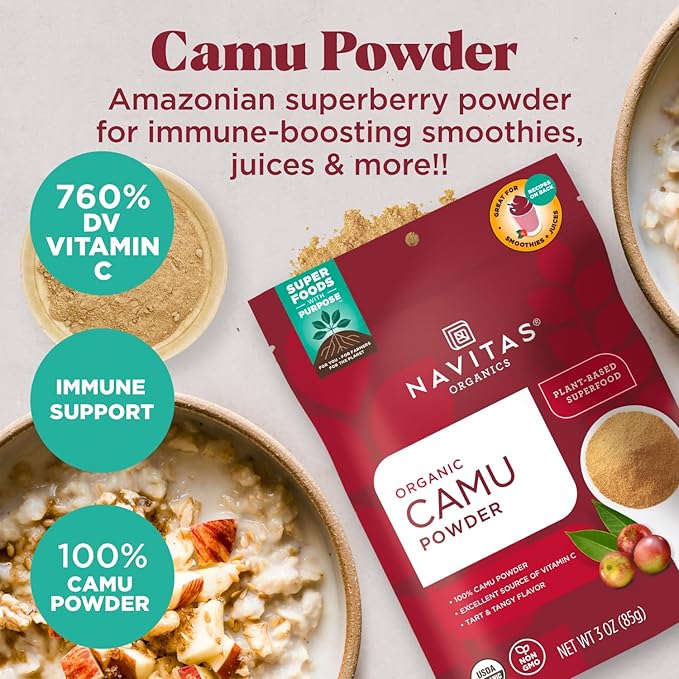 Navitas Organics Camu Powder – For Smoothies, Juices, Wellness Shots & More – Vitamin C, Antioxidants – Immune Support – USDA Organic, Non GMO, Kosher Gluten Free, Vegan (4oz. Bag, 4 Servings)