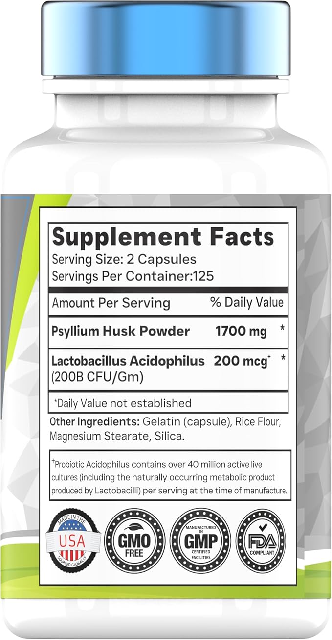 Psyllium Husk Capsules | 1700 MG - 250 Capsules | with Probiotic Acidophilus | Extra Strength Soluble & Dietary Fiber Supplement | Supports Digestive Health