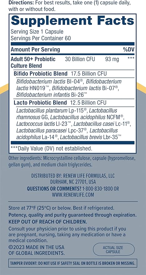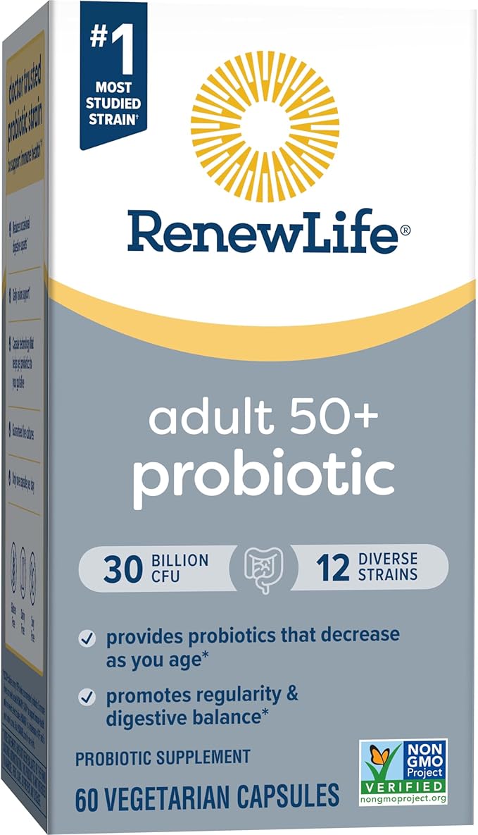 - PROBIOTIC: Includes one 60-count bottle of Renew Life Probiotic Adult 50 Plus Capsules 30 Billion CFU to support digestive health and provide daily immune support (1)
