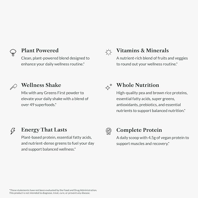- Vegan, Plant-Based Protein. Each serving of Greens First Boost provides five grams of premium-quality vegan protein derived from non-GMO brown rice and pea protein isolate, supporting muscle health and recovery.