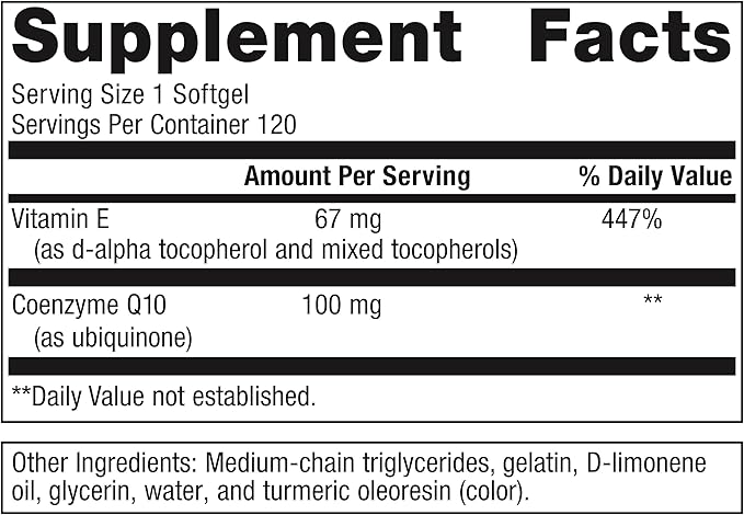 - Vitamin E: CoQ10 formula also features vitamin E as d-alpha tocopherol and mixed tocopherols for added support; non-GMO and gluten-free