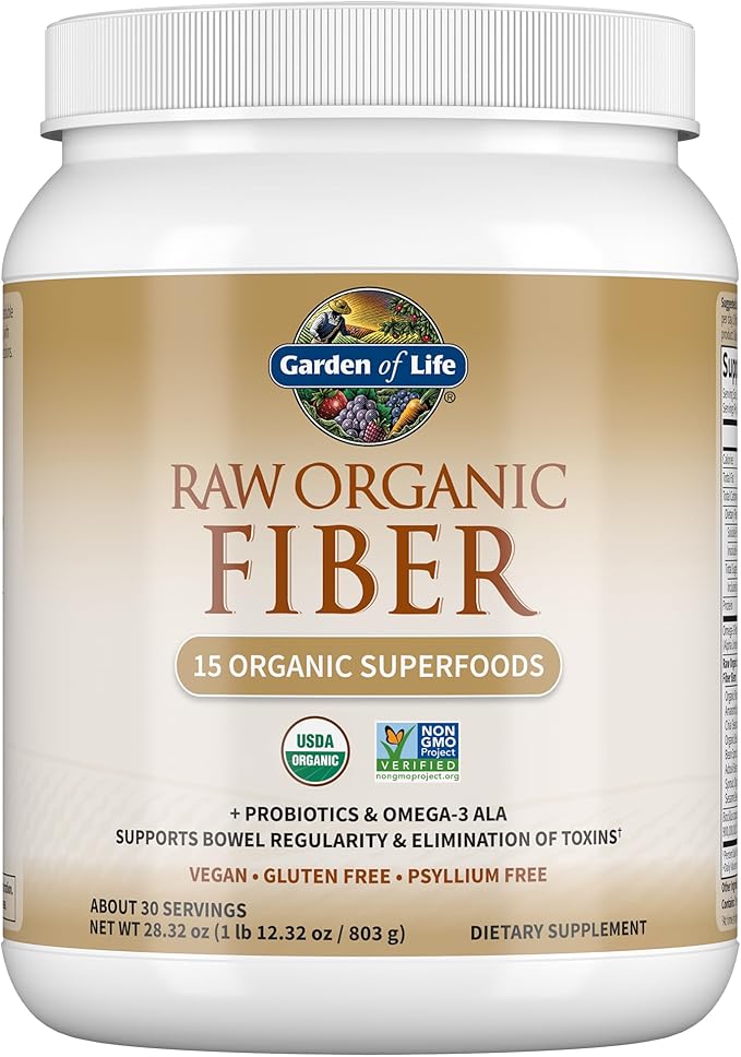 Garden of Life Raw Organic Fiber Powder, 30 Servings, 15 Organic Superfoods, Probiotics, Omega-3 ALA, 4g Soluble Fiber, 5g Insoluble for Regularity, Psyllium Husk Free