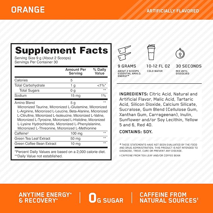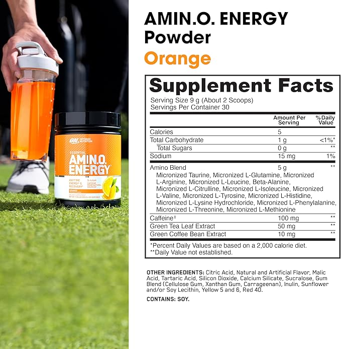 Optimum Nutrition Amino Energy - Pre Workout with Green Tea, BCAA, Amino Acids, Keto Friendly, Green Coffee Extract, Energy Powder - Orange Cooler, 30 Servings (Packaging May Vary)