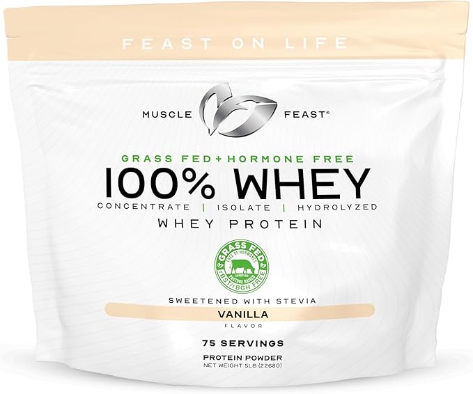 Muscle Feast 100% Grass Fed Whey Protein Powder, All Natural, Hormone Free Paure Raised Whey Protein Powder for Women & Men - Whey Concentrate, Isolate & Hydrolyzed Protein Powder Blend - Vanilla, 5lb