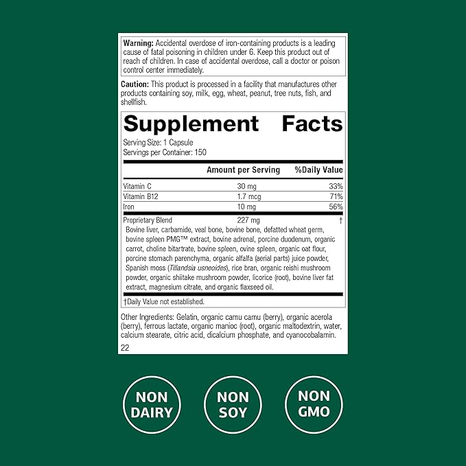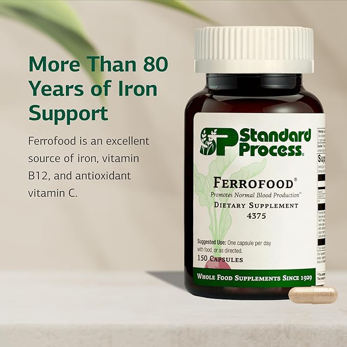 Standard Process Ferrofood - Blood Health Supplement - Enzyme Support with Vitamins B12, C, & Iron - Non-Dairy & Non-Soy - 150 Capsules (40 Servings)