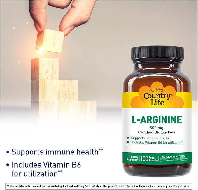 Country Life L-Arginine Caps with Vitamin B-6, 500mg, 100 Vegan Capsules, Certified Gluten Free, Certified Vegan