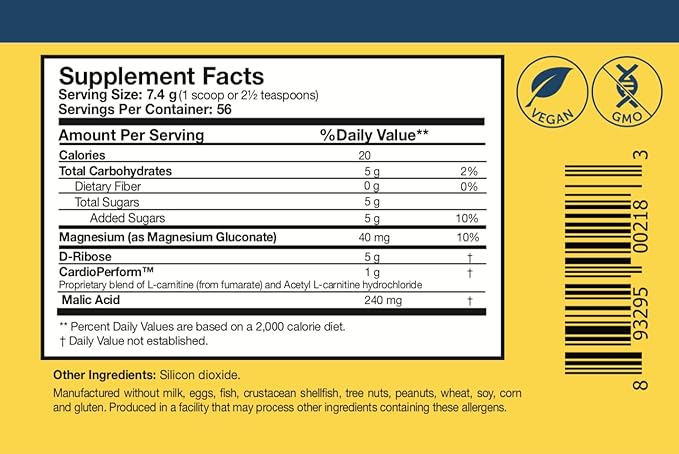- Optimize Energy Production - A potent D ribose powder blend with an Acetyl L-carnitine (supports heart & brain health) and l carnitine supplement (transports fuel into the heart to be burned as energy), plus malic acid, and magnesium gluconate to optimize energy production and synthesis.*"