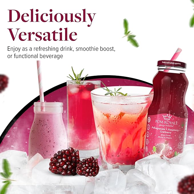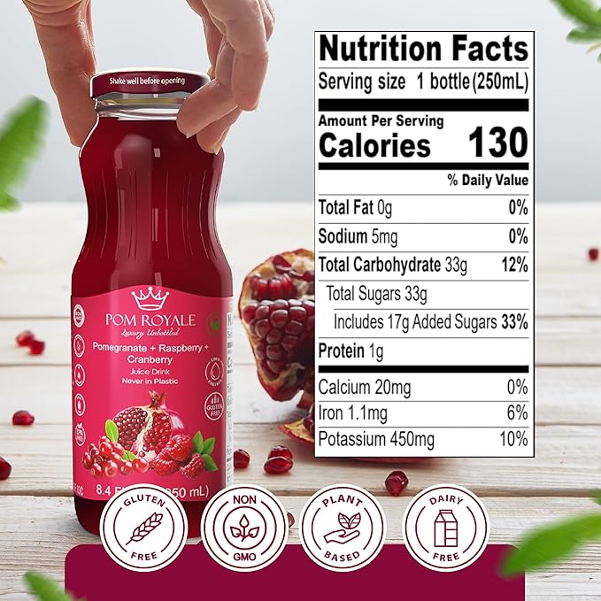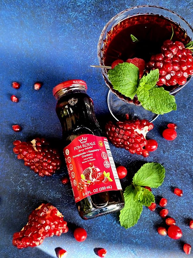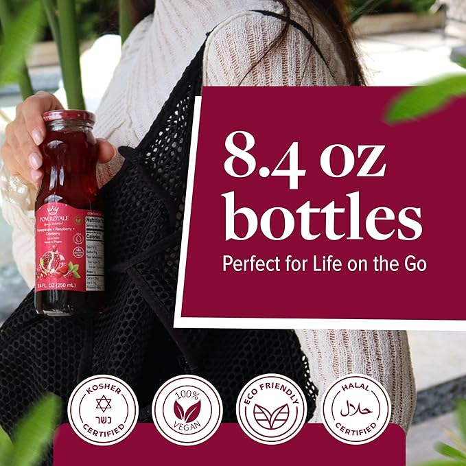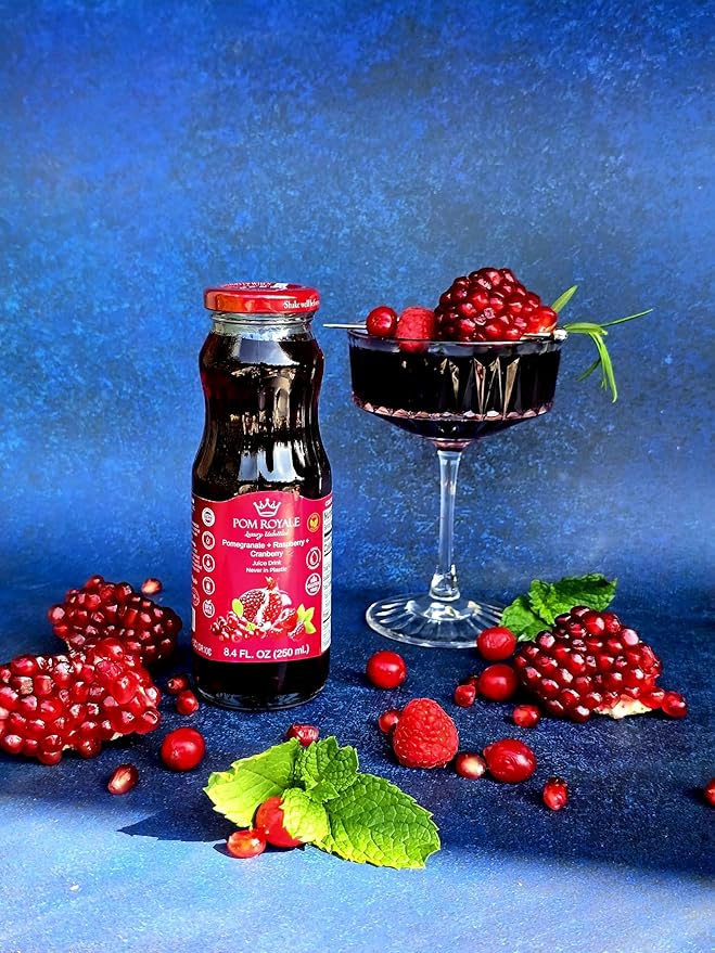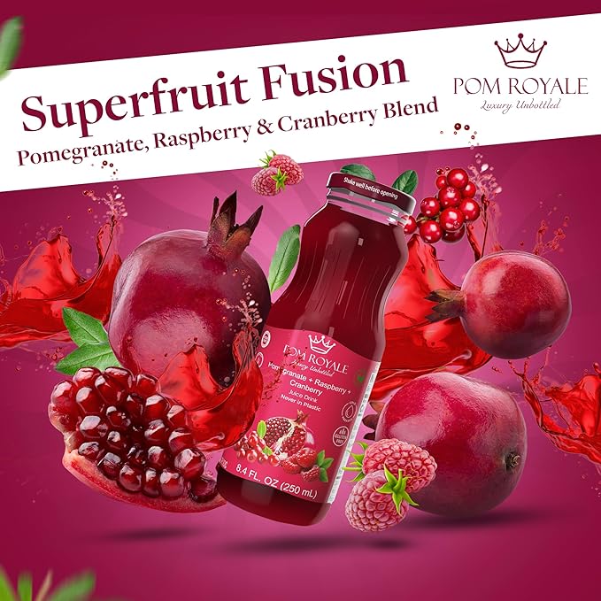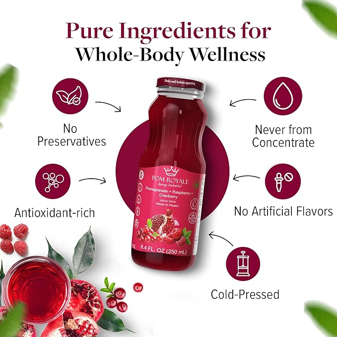- Cold-Pressed Superfruit Blend: Made with pure cold pressed pomegranate juice and mixed with raspberry juice, and cranberry juice