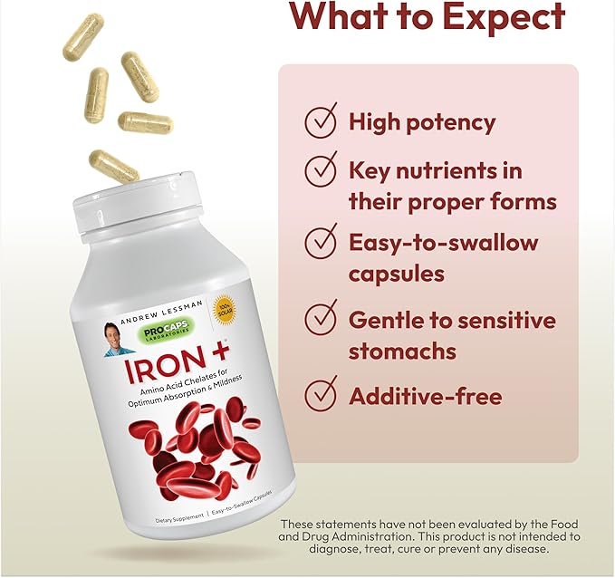 ANDREW LESSMAN Iron Plus 90 Capsules - 18mg Iron, 100% Pure Amino Acid Chelated Iron (Glycinate, Aspartate), Plus Vitamin C for Increased Absorption, Small, Easy to Swallow Capsules, No Additives