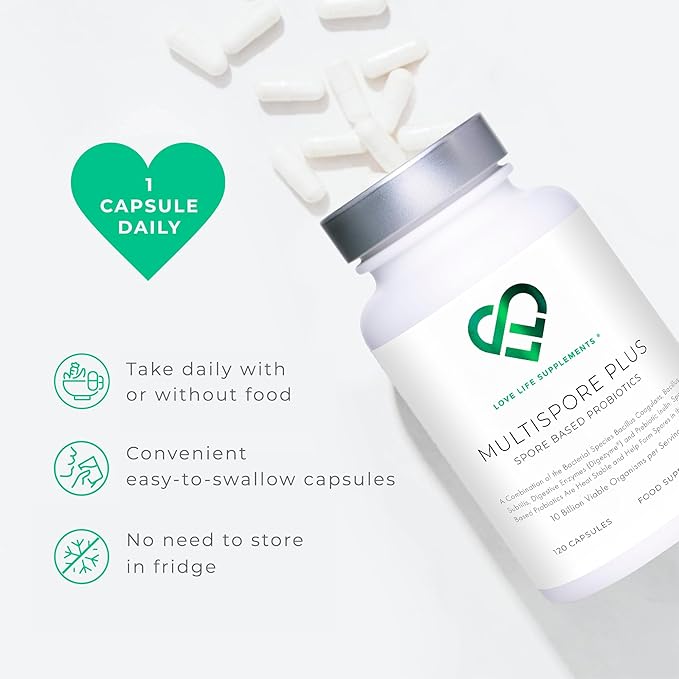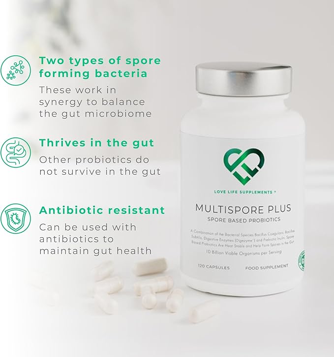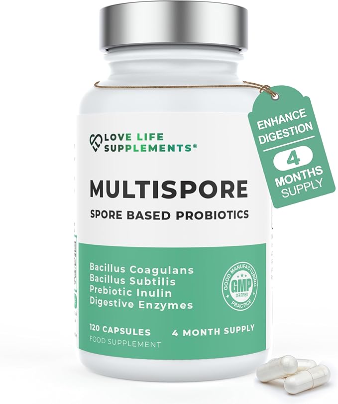 MultiSpore® Plus (Bacillus Coagulans & Bacillus Subtilis) Spore Based Probiotic | 120 Capsules - 4 Month Supply | Bloating Relief/Gut Health | Includes Digestive Enzymes & Prebiotic Inulin | UK Made