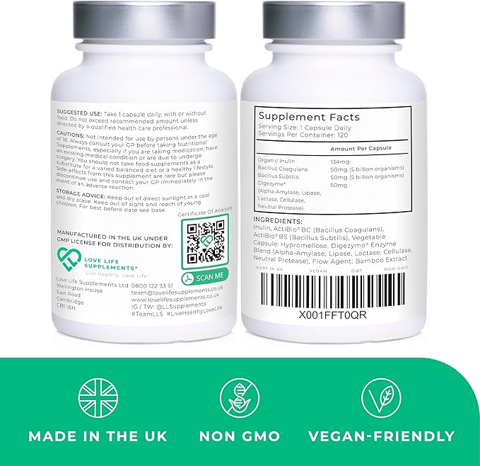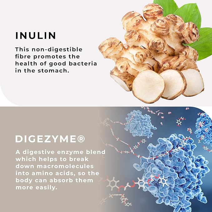 - PREBIOTIC INULIN BENEFO ORAFTI, a beneficial fibre derived from the chicory root, is included in our formula. This ingredient nourishes and promotes the growth of good bacteria, further supporting gut health.
