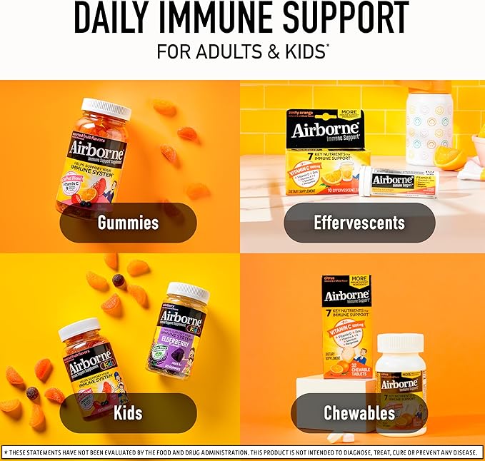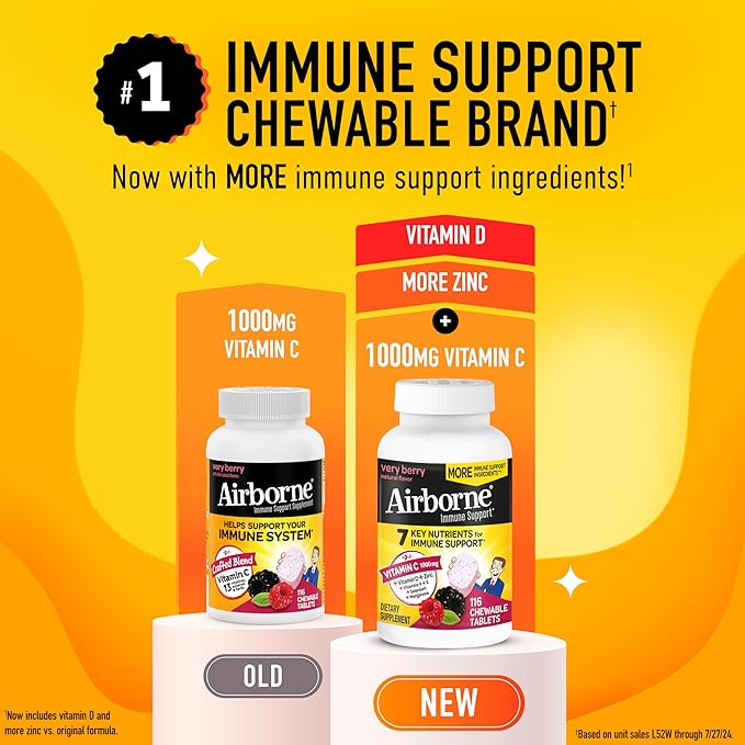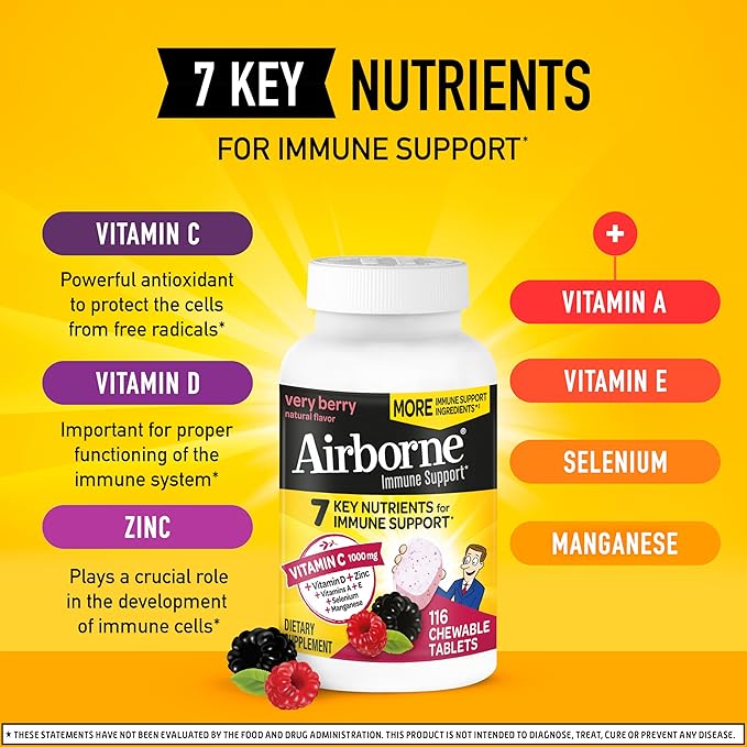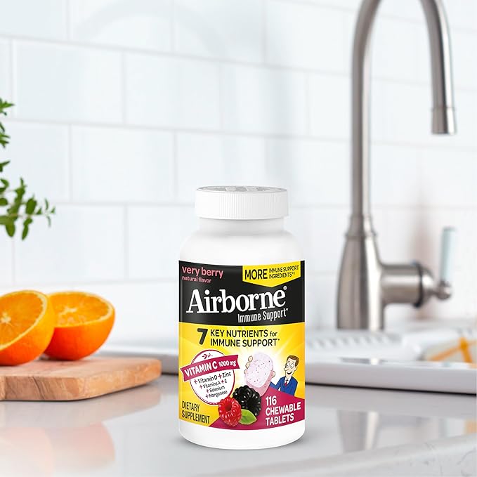 Airborne Vitamin C 1000mg (per Serving) - Very Berry Chewable Tablets (116 Count in a Bottle), Gluten-Free Immune Support Supplement, with Vitamins A C E, Zinc, Selenium, Ginger, Antioxidants
