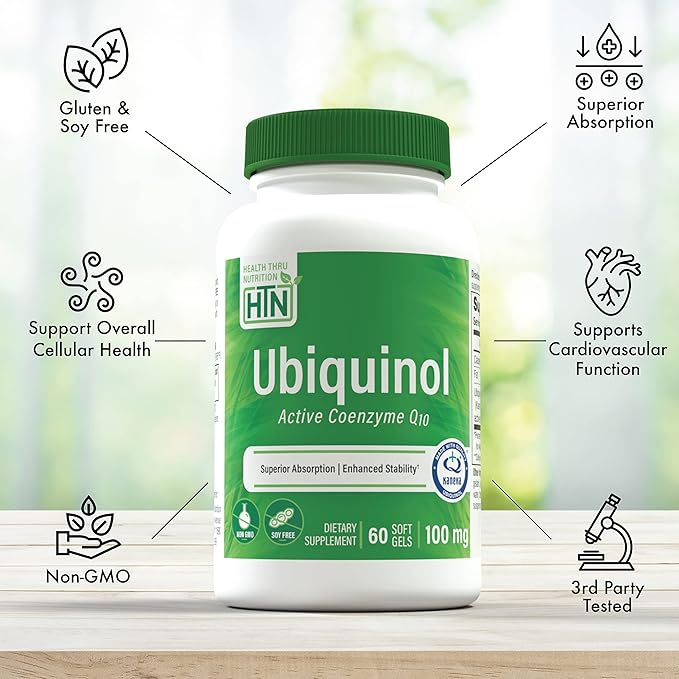 Health Thru Nutrition Ubiquinol 100mg 60 Softgels as Kaneka QH Reduced CoQ-10 | Stabilized - 3rd Party Tested | Enhanced Bioavailability | Cardiovascular & Mitochondria Function Support | Non-GMO