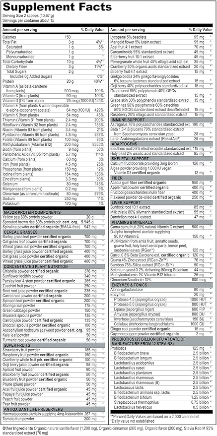 - Made with superfood ingredients to deliver 20 grams of plant protein, antioxidant-rich servings of fruits and vegetables and 25 billion CFU from 12 probiotic strains