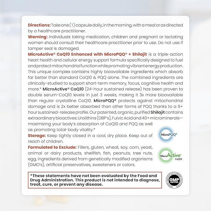 MicroActive CoQ10 Enhanced with MicroPQQ + Shilajit โSustained Releaseโ 60 Veg Caps | Convenient Once a Day Clinical Dose | 2 Month Supply | Vegan | Pharmaceutical Grade