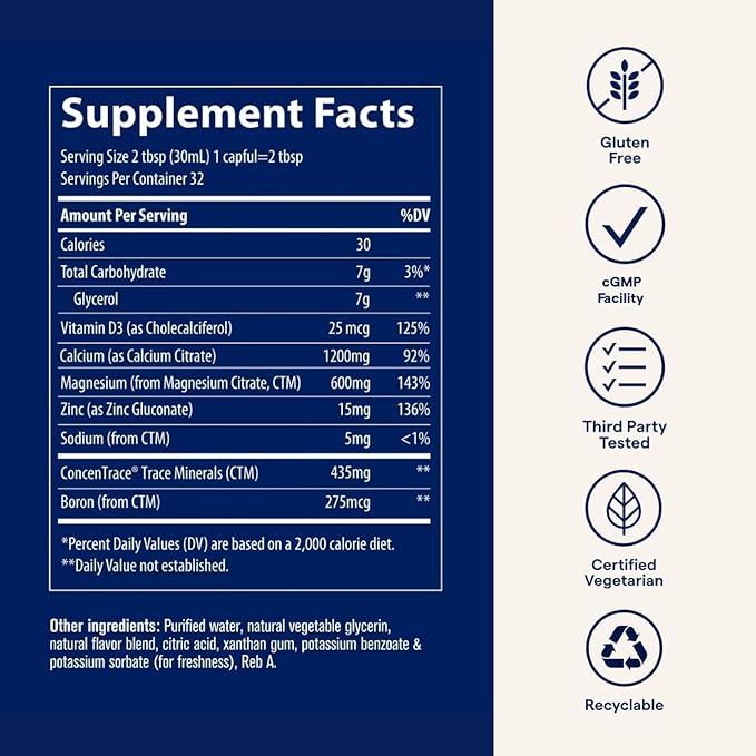 - FAST ABSORBING LIQUID – Liquid Cal Mag Zinc comes in a delicious natural flavor that makes it easy to take daily. Concentrace, a complete spectrum of ionic trace minerals, aids in the absorption process.