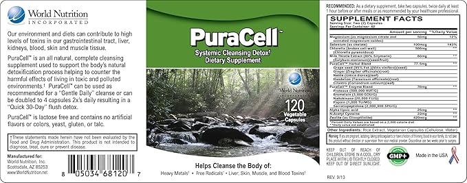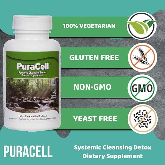 - World Nutrition PuraCell is a potent blend comprising minerals, herbs, enzymes, and chlorella.
