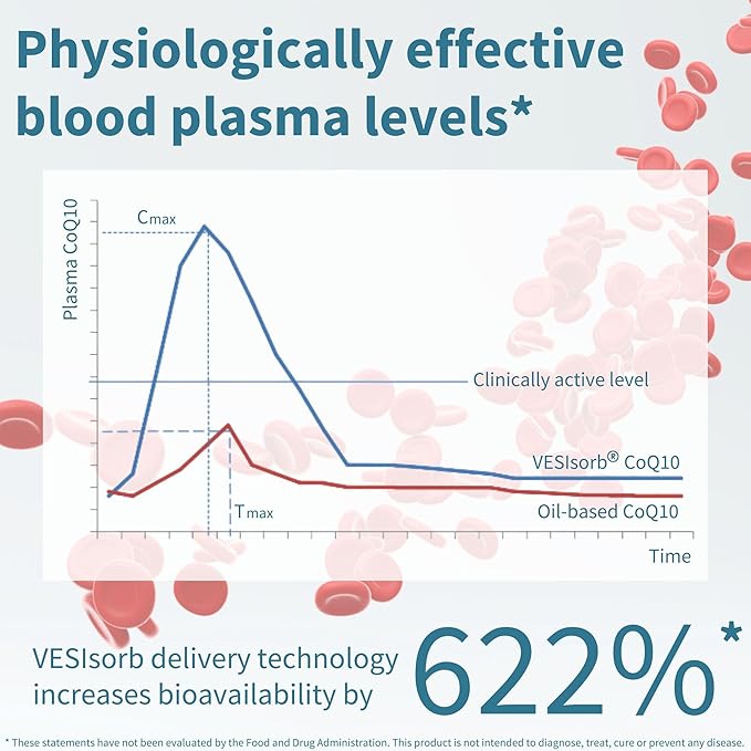 - ONE-A-DAY WITH ALL-DAY ACTION: to benefit from ubiquinol, blood plasma concentrations must remain high. Offering 622% increased bioavailability, VESIsorb optimises the benefits of CoQ10 supplementation*