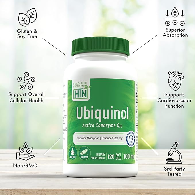 Health Thru Nutrition Ubiquinol 100mg 120 Softgels as Kaneka QH Reduced CoQ-10 | Stabilized - 3rd Party Tested | Enhanced Bioavailability | Cardiovascular & Mitochondria Function Support | Non-GMO