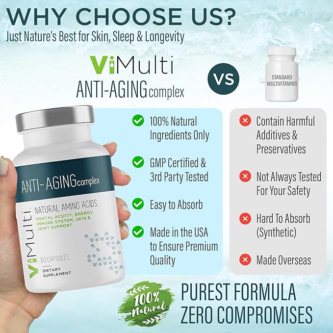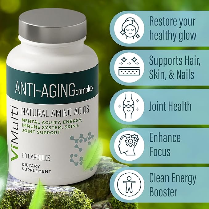 - FEEL YOUNGER – LOOK YOUNGER: ViMulti Anti-Aging Supplement is a powerful longevity mix, promoting immune support and youthful skin tone. This amino acids supplement for women helps with metabolism and acts as skin vitamins for both men and women, while boosting focus factor for enhanced clarity and focus.