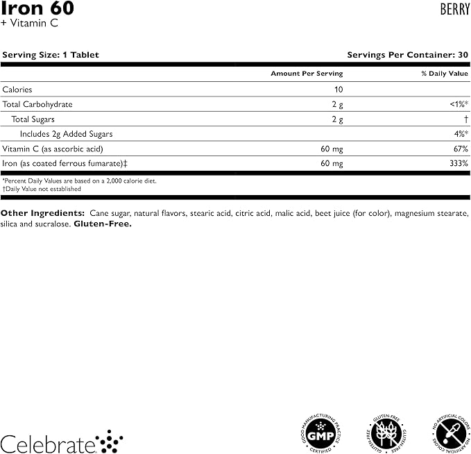 Celebrate Vitamins Iron Supplement with 60mg Iron & Vitamin C – Berry Chewables for Bariatric Patients, Gastric Bypass & Sleeve Gastrectomy Support – 30 Tablets for Post-Surgery Health Maintenance