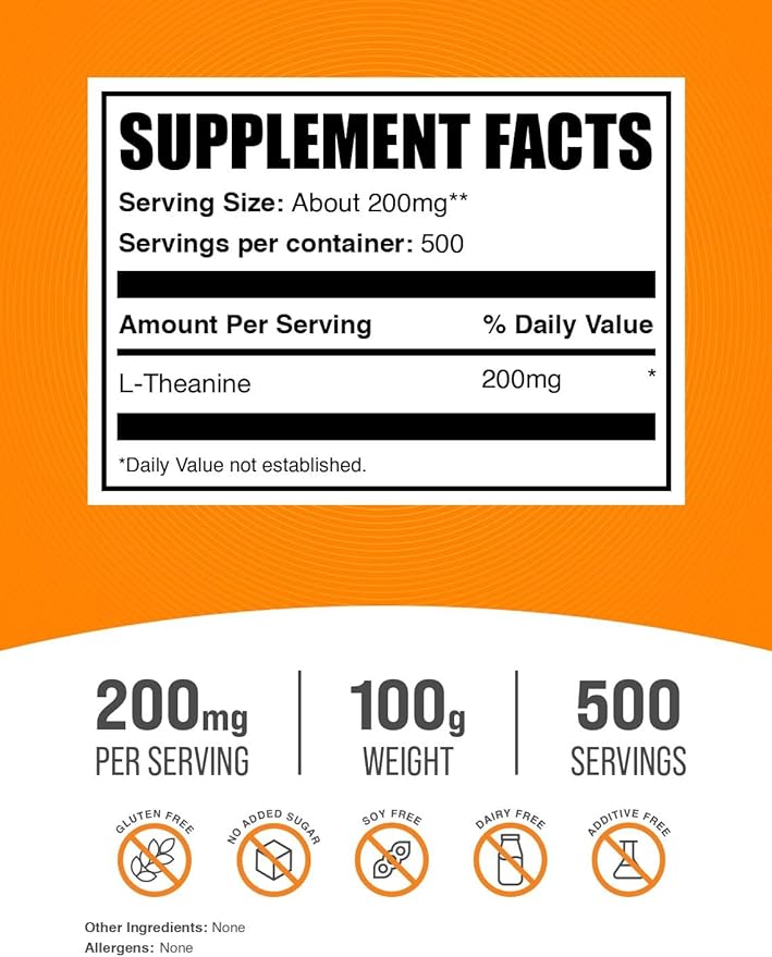 BulkSupplements.com L-Theanine Powder - L-Theanine Supplement, L-Theanine 200mg - Amino Amino Supplement, Pure & Gluten Free, 200mg per Serving, 100g (3.5 oz) (Pack of 1)