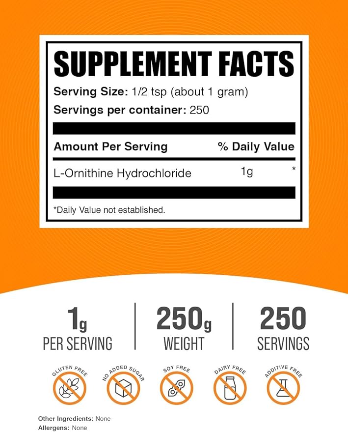 BulkSupplements.com L-Ornithine HCl Powder - Ornithine Supplement, Amino Acids Supplement - Gluten Free, 1g per Serving, 250g (8.8 oz) (Pack of 1)