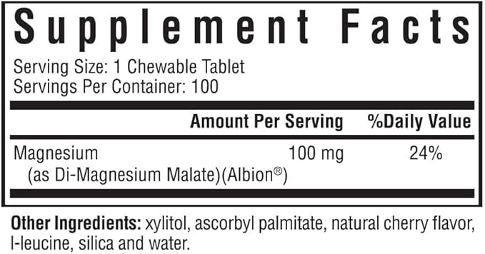 - Well-absorbed: Provides 100 mg of high-absorption chelated magnesium (as dimagnesium malate) per chewable tablet for superior absorption