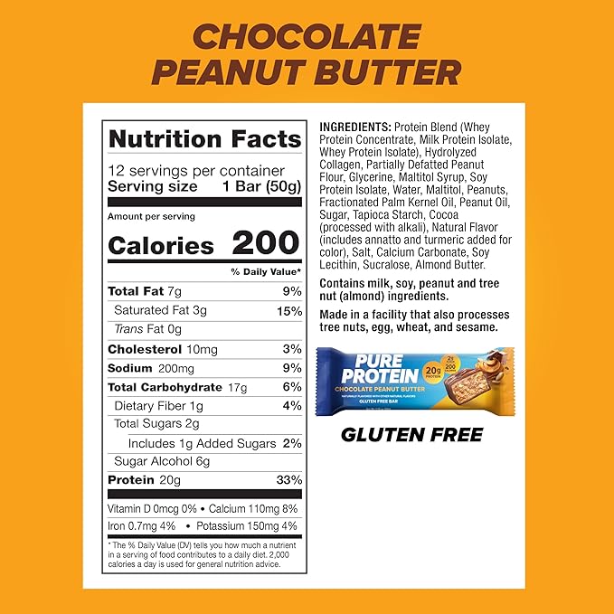- DELICIOUS HIGH PROTEIN BAR: Pure Protein Chocolate Peanut Butter Bars are full of flavor and contain 20g of protein for lasting energy. Each delicious bar is gluten free with high-quality protein that helps build lean muscle and strength.