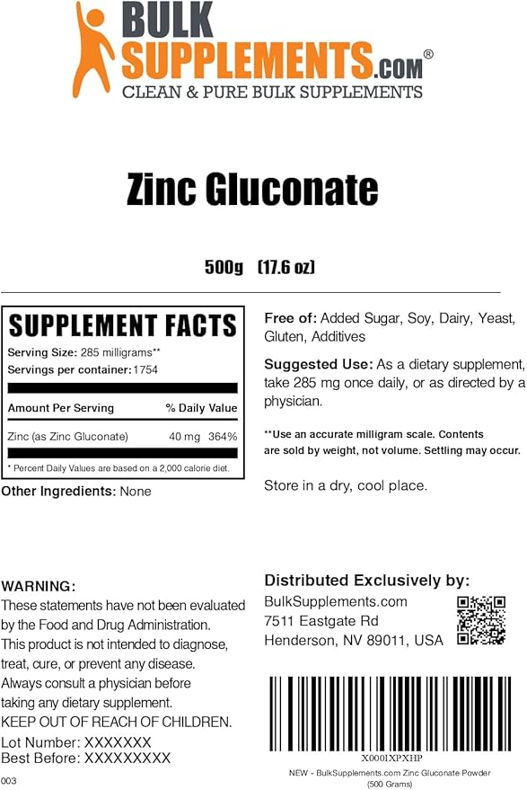 BulkSupplements.com Zinc Gluconate Powder - Zinc 40mg, Mineral Supplement for Immune Support - Gluten Free, 285mg per Serving, 500g (1.1 lbs) (Pack of 1)