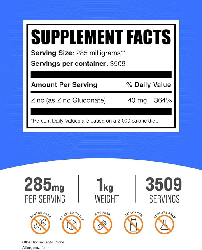 BulkSupplements.com Zinc Gluconate Powder - Zinc 40mg, Mineral Supplement for Immune Support - Gluten Free, 285mg per Serving, 1kg (2.2 lbs) (Pack of 1)