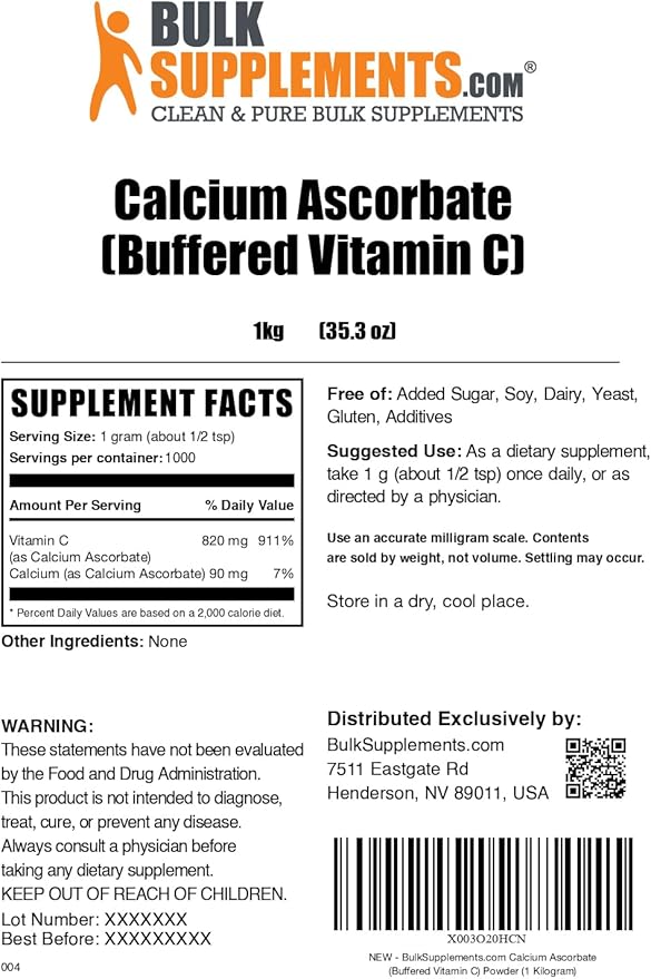 BulkSupplements.com Calcium Ascorbate Powder - Buffered Vitamin C, Calcium Supplement with Vitamin C - Gluten Free, 1g per Serving, 1kg (2.2 lbs) (Pack of 1)