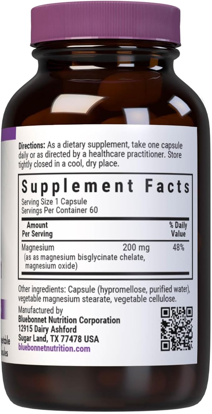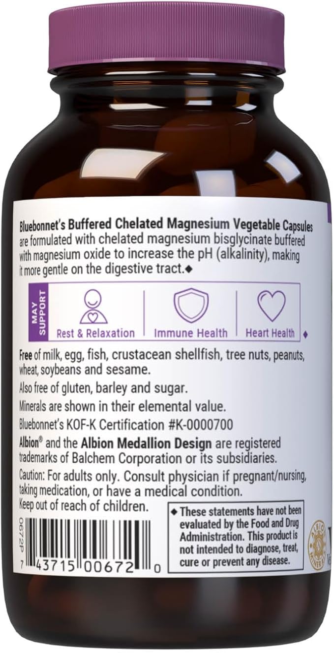 Bluebonnet Nutrition Albion Buffered Chelated Magnesium 200 mg, Magnesium Oxide, Stress Relief, Vegan, Non GMO, Gluten Free, Soy Free, Milk Free, Kosher, 60 Vegetable Capsules, 1 Month Supply